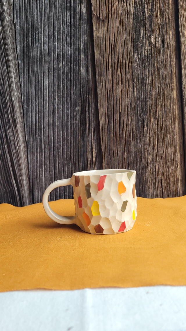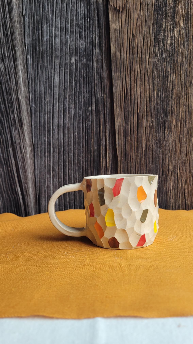 Tasse avec anse, façon écorce, en grès et émaillée en transparent.
