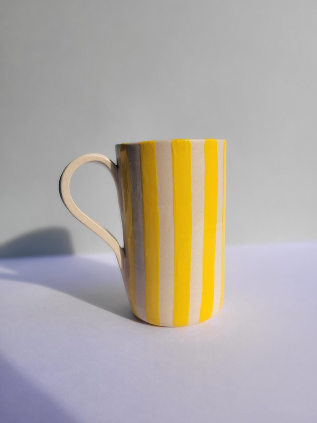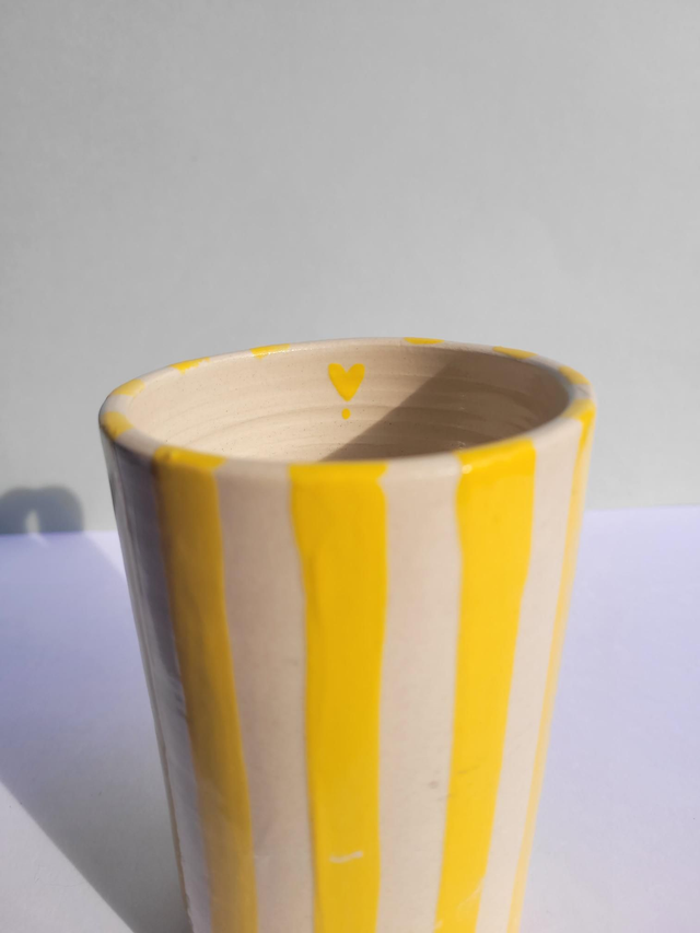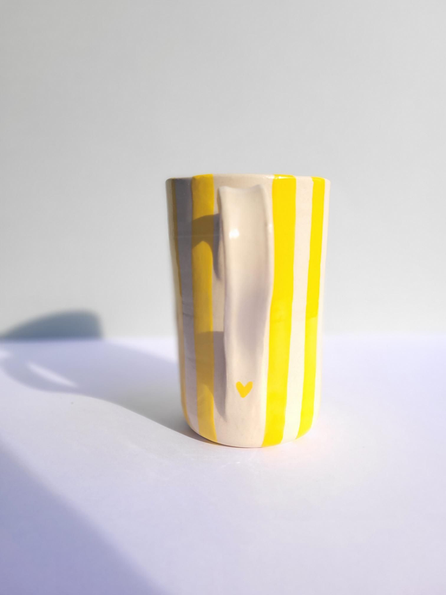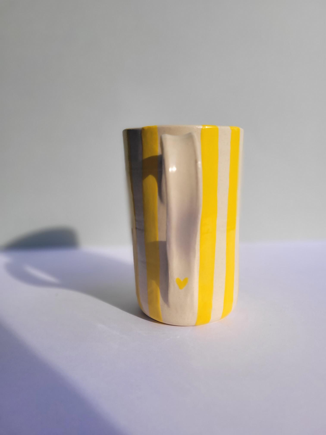 Grand mug de 500ml, rayé jaune et entièrement émaillé, petit motif coeur à l'intérieur et en bas de la anse.