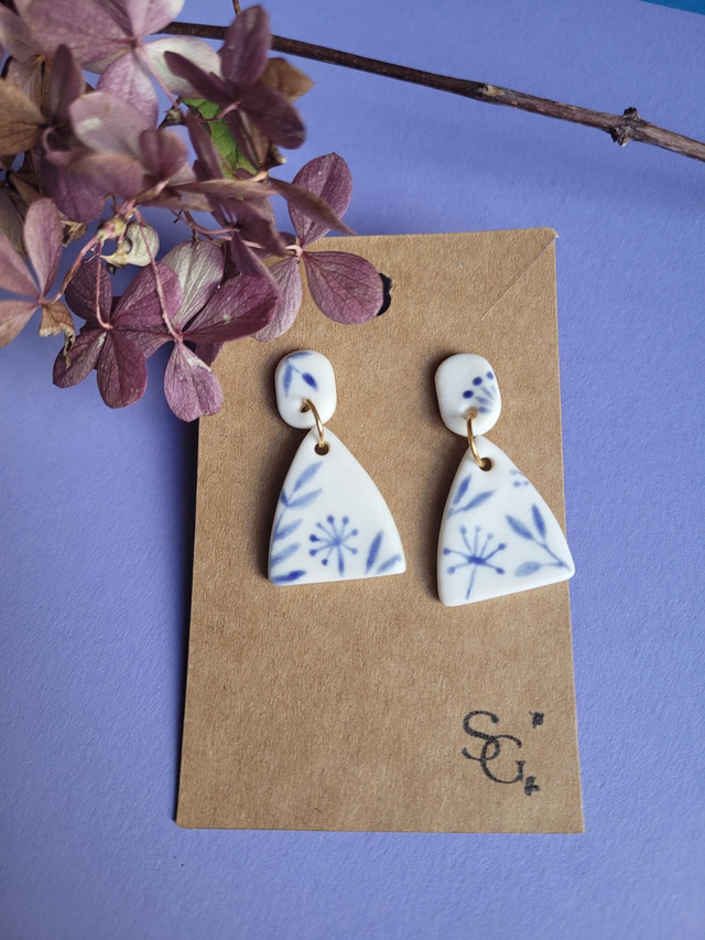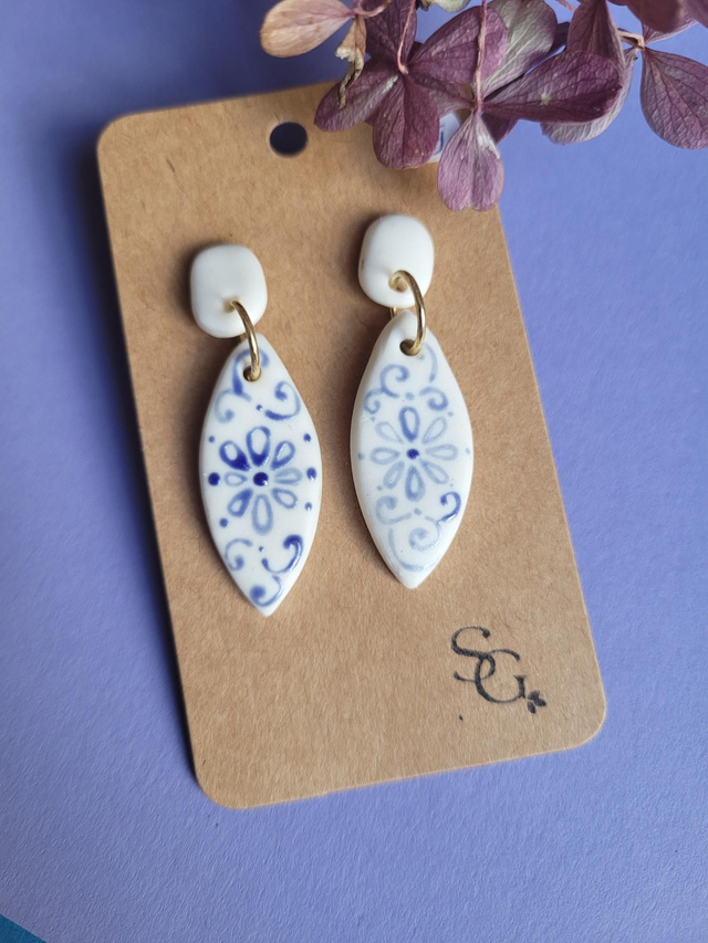 Boucles entièrement faites à la main, motif fleuri fait en email bleu sur porcelaine brut.
