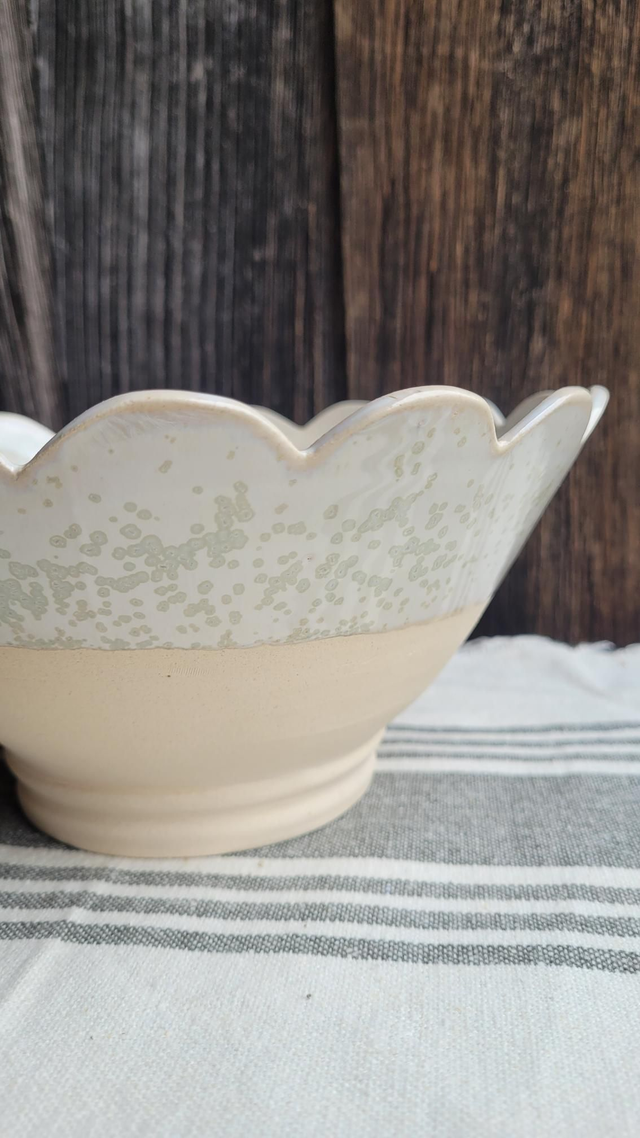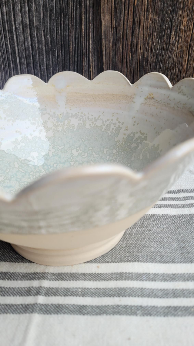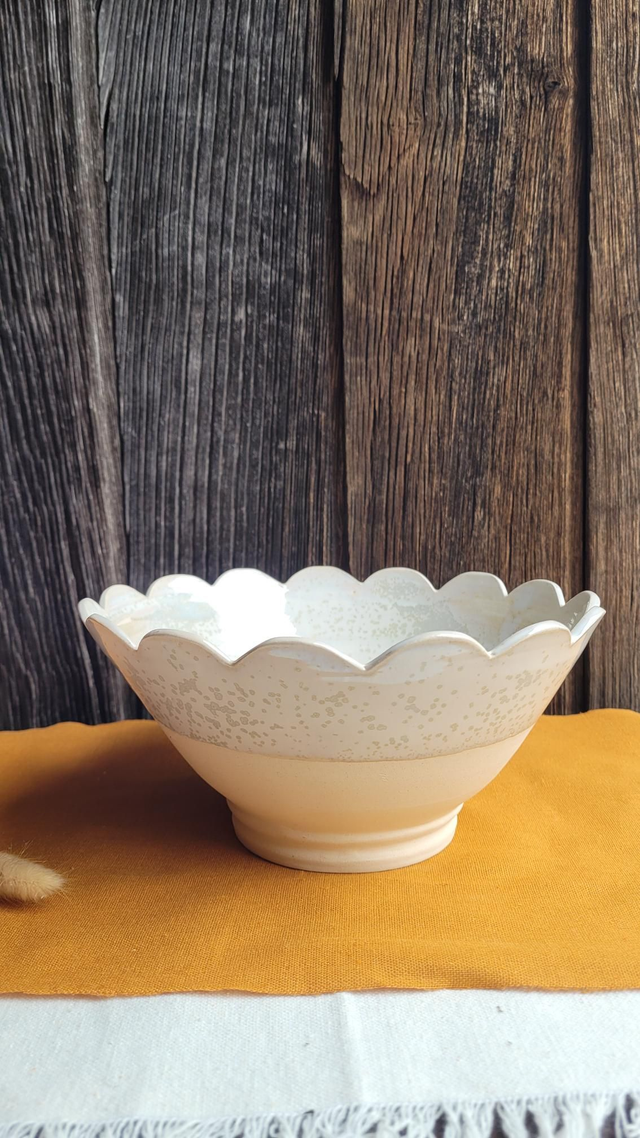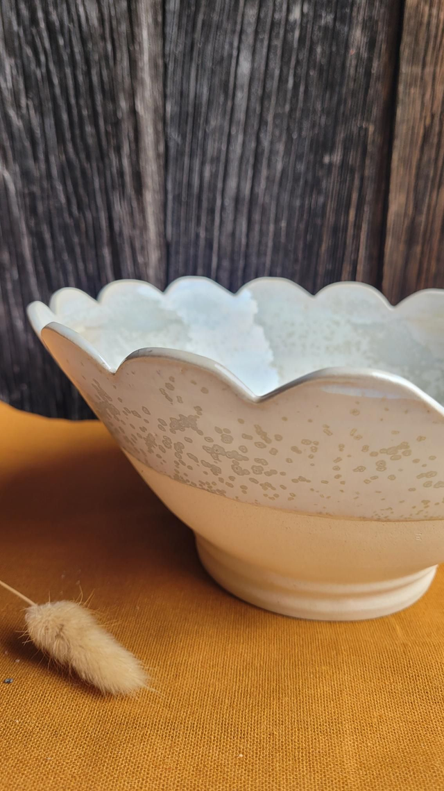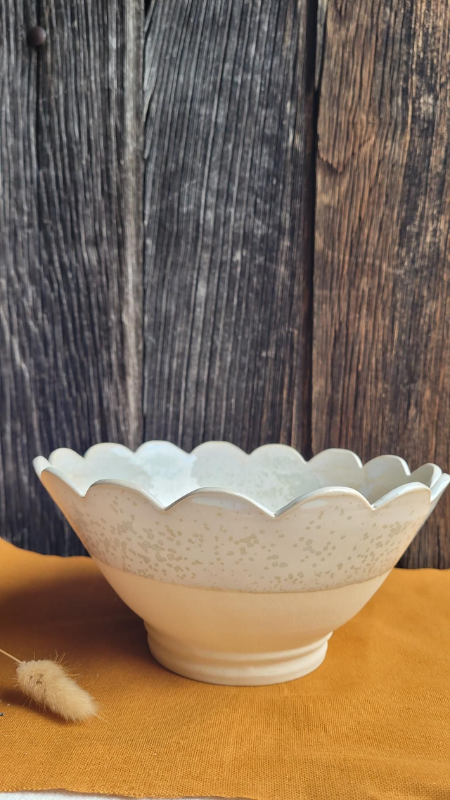 Saladier en grès, tourné et décoré à la main, chaque pétale est mesurée puis découpée.