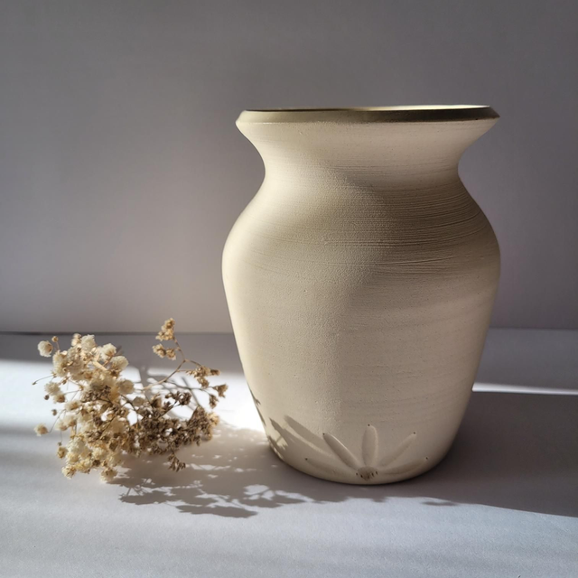 Vase, grès brut à l' extérieur avec décor gravure à la base.